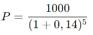 Com isso, podemos extrair uma observação muito importante. Em um cenário de expectativa de aumento da taxa de juros, o que acontece com o preço do título prefixado? Vamos utilizar agora as mesmas variáveis e mudar somente o juros, que ao invés de 9,5% agora será 14%.